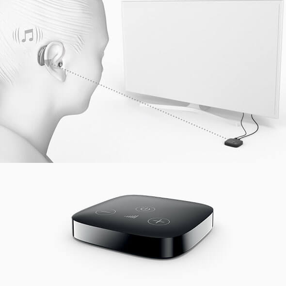 O TV Connector é uma interface “plugue e use” para a TV e outras fontes de áudio, suportando conectividade direta com os aparelhos auditivos Phonak, como se você estivesse usando fones de ouvido.